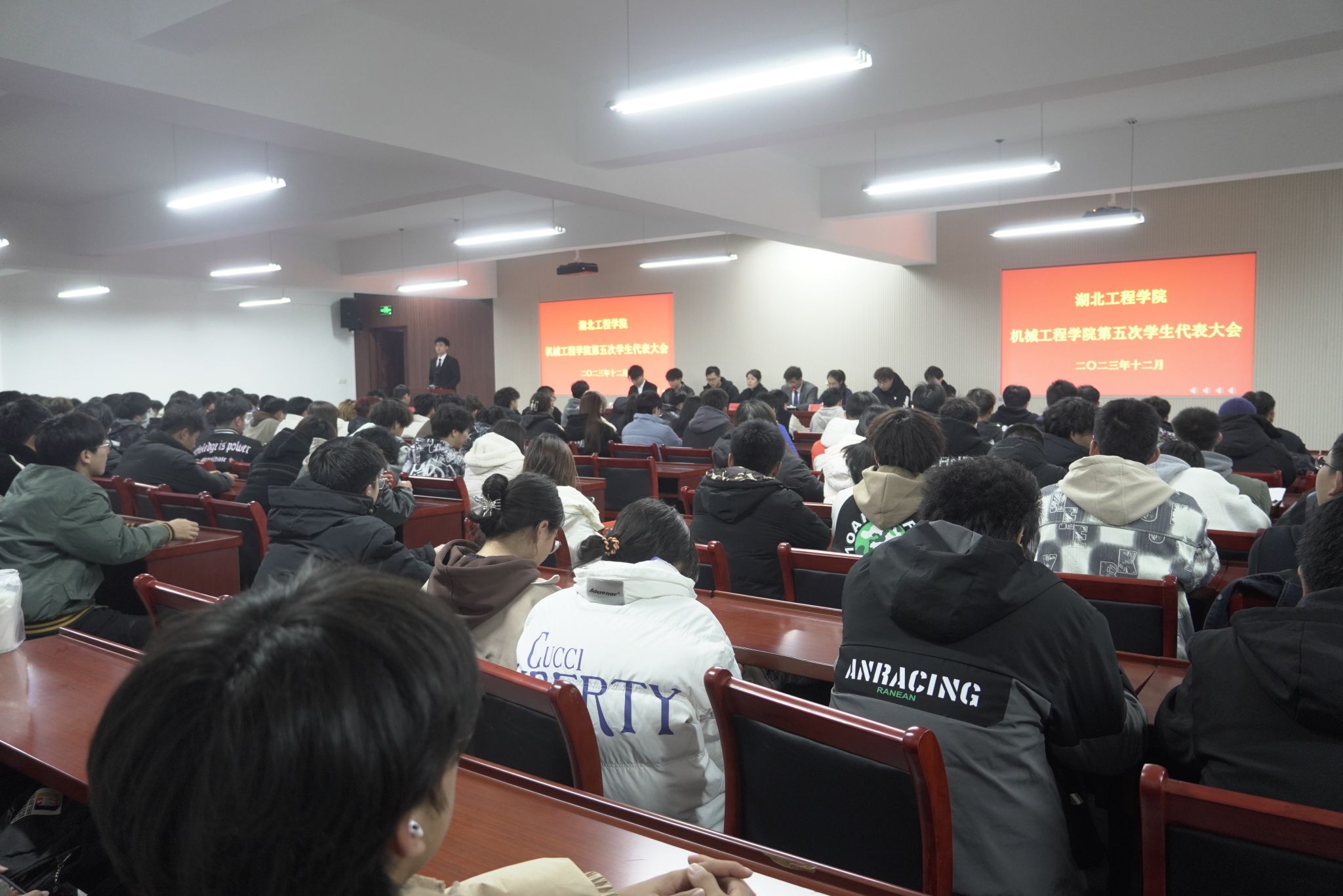 会议在雄壮的国歌中拉开了帷幕,校学生会主席周何言同学致辞,他代表校学生会对大会的召开表示祝贺,并表示在往后的工作和学习中,希望全体学生干部恪守本分,认真学习,踏实工作,要加强校院联系,更好的为学校师生服务。