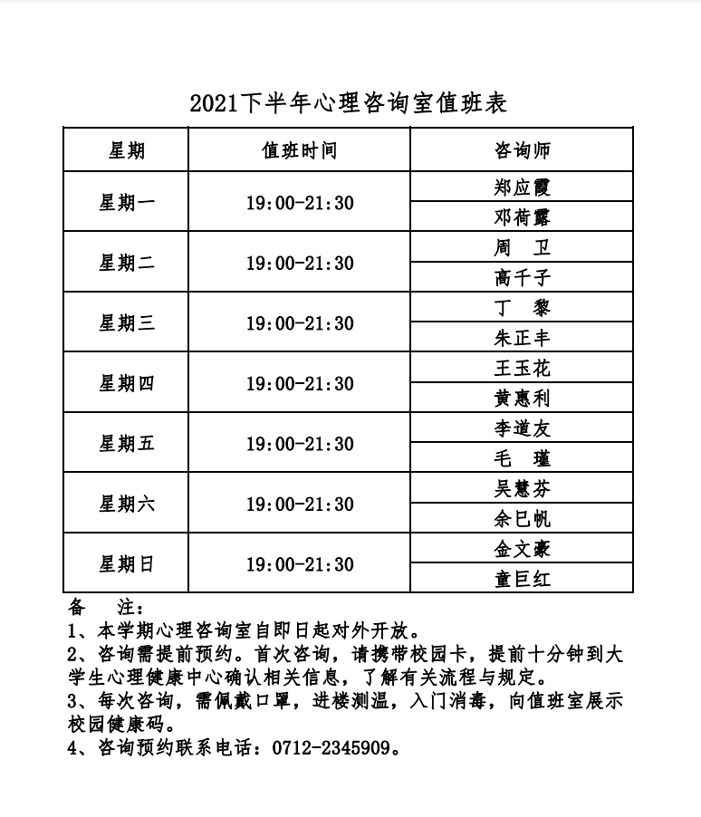威廉williamhill2021年下半年心理咨询室值班表