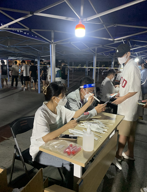 在核酸检测现场,志愿者们在做好自我防护的同时,各司其职,全面协助医护人员做好信息登记、人员疏导、为大家答疑解惑等工作。他们严格落实疫情防控措施,提醒每一位排队居民佩戴好口罩,认真负责地指导现场人员填写信息,协助医护工作者做好检测前的信息核对工作,确保核酸检测工作顺利进行。